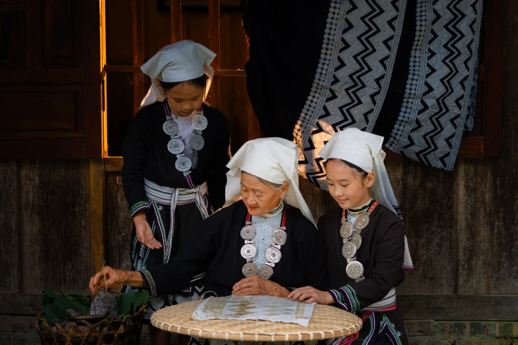 Không cần thước kẻ hay bản phác thảo, phụ nữ Dao Tiền vẽ hoa văn hoàn toàn bằng trí nhớ và cảm quan. Sáp ong nóng chảy khi vẽ lên vải sẽ ngăn màu chàm ngấm vào, tạo nên những hoa văn trắng xanh độc đáo. Một kỹ thuật “in ấn” thủ công đầy trí tuệ của người xưa.
