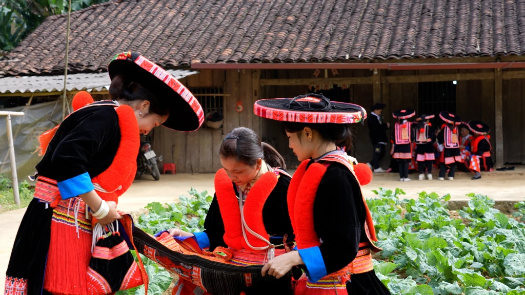 Nếu người Tày, Nùng ưa sự trầm mặc của màu chàm, người Dao Đỏ lại thắp lửa núi rừng bằng sắc đỏ rực rỡ trên trang phục. Từng mũi thêu, từng quả bông len đỏ là lời khẳng định về bản sắc, sự tự tin và niềm tin vào sự may mắn, sung túc của tộc người này.