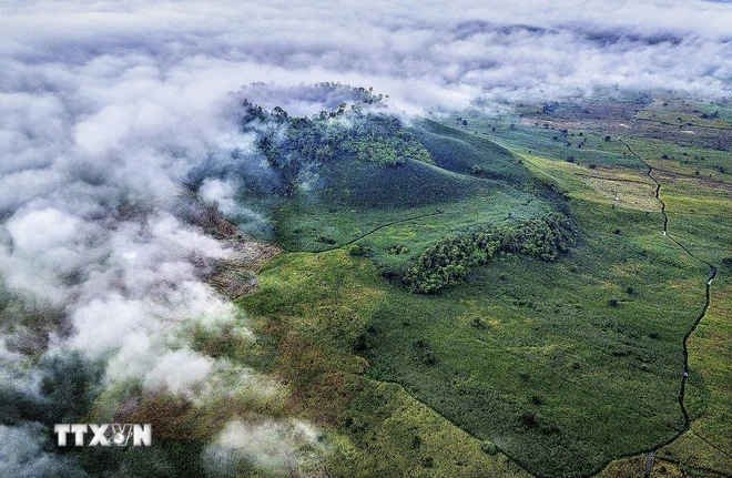 Núi lửa Nâm Blang có địa chất, địa mạo độc đáo với nhiều dấu tích cư trú của người tiền sử. (Ảnh: TTXVN phát)