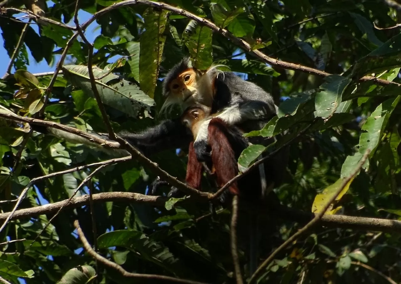 | Là một trong những vùng sinh học quan trọng bậc nhất Đông Nam Á, Hin Nam No là nơi cư trú của hơn 800 loài động vật có xương sống. Linh trưởng là nhóm nổi bật với ít nhất 10 loài, trong đó có voọc chà vá chân đỏ, vượn má trắng phương Nam, cu li nhỏ và năm loài khỉ đuôi dài quý hiếm. Trong ảnh: Hai mẹ con voọc chà vá chân đỏ. (Nguồn: Vườn Quốc gia Hin Nam No) |