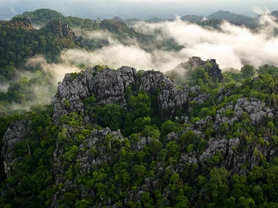 | Tên gọi “Hin Nam No” mang nghĩa “đỉnh núi nhọn như măng tre” – một cách mô tả chính xác về địa hình hiểm trở, với các khối núi đá vôi dựng đứng, cao đến 300 mét, xen lẫn các thung lũng hẻo lánh, tạo nên môi trường sống biệt lập – nơi nhiều loài sinh vật tiến hóa độc lập suốt hàng triệu năm. (Nguồn: Vườn Quốc gia Hin Nam No) |