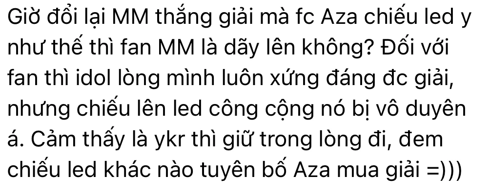 Một số fan Mỹ Mỹ giải thích từ "our" (chúng tôi) ám chỉ đến nội bộ fandom với nhau - như một cách thể hiện "cúp trong lòng người hâm mộ là chiếc cúp danh giá nhất". "Our" không bao hàm tất cả mọi người nên việc tố FC Mỹ Mỹ "nhận vơ" là không đúng. Vài ý kiến vẫn tin rằng, chiếc bảng LED là nhạy cảm, thiếu tinh tế đối với Ánh Sáng AZA và fandom của nữ ca sĩ trẻ.