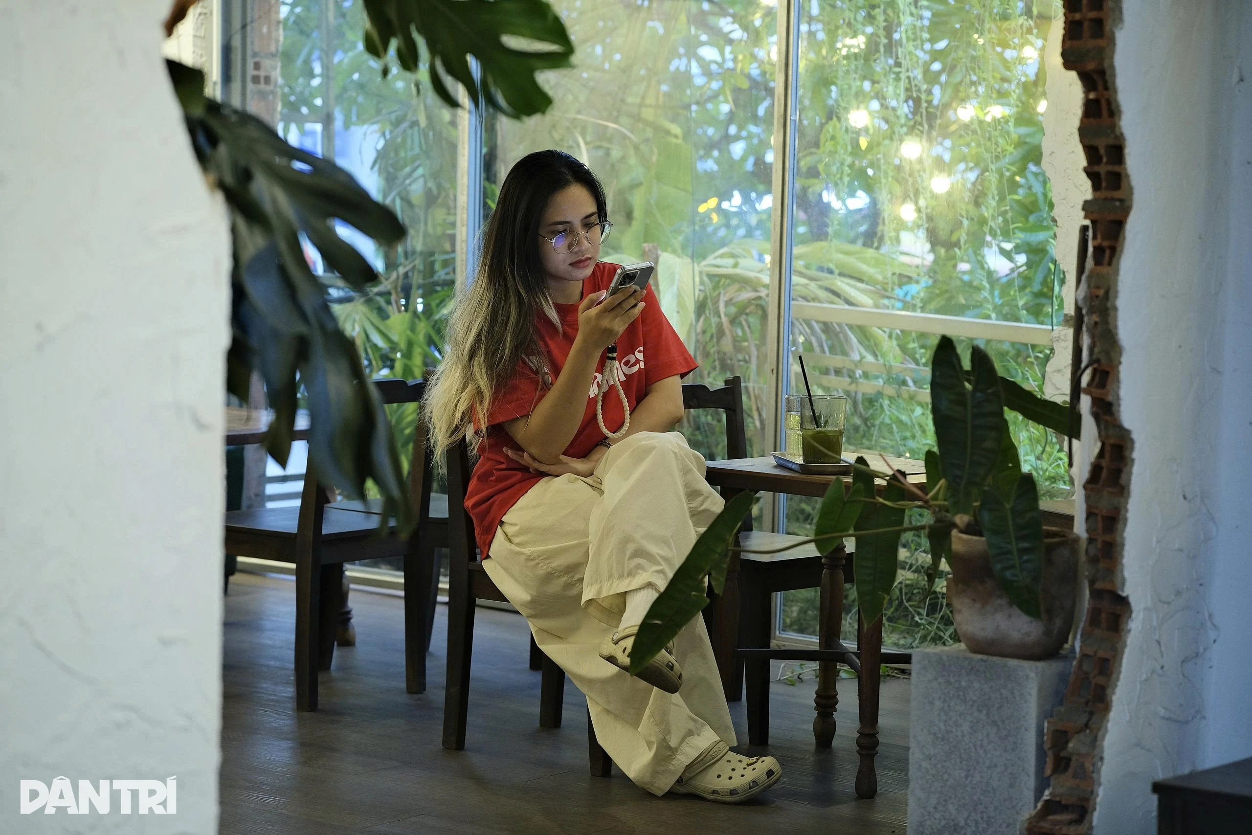 Khán giả Thúy Vy ngồi ở quán cà phê chờ ngớt mưa để xem chương trình (Ảnh: Quỳnh Tâm).