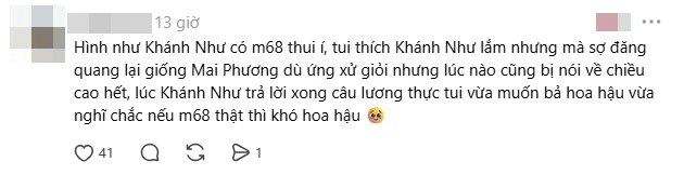 Được biết, Khánh Như sở hữu chiều cao 1m69, số đo ba vòng lần lượt là 84-63-98 cm. Các fan sắc đẹp cho rằng việc có chiều cao dưới 1m70, vóc dáng có phần nhỏ nhắn của Khánh Như sẽ không phải là lợi thế nếu tham gia các cuộc thi quốc tế. Điều này khiến netizen tự suy đoán đây phần nào là lý do khiến cô chỉ dừng chân ở ngôi Á hậu 1.