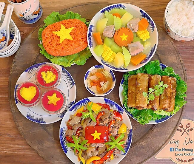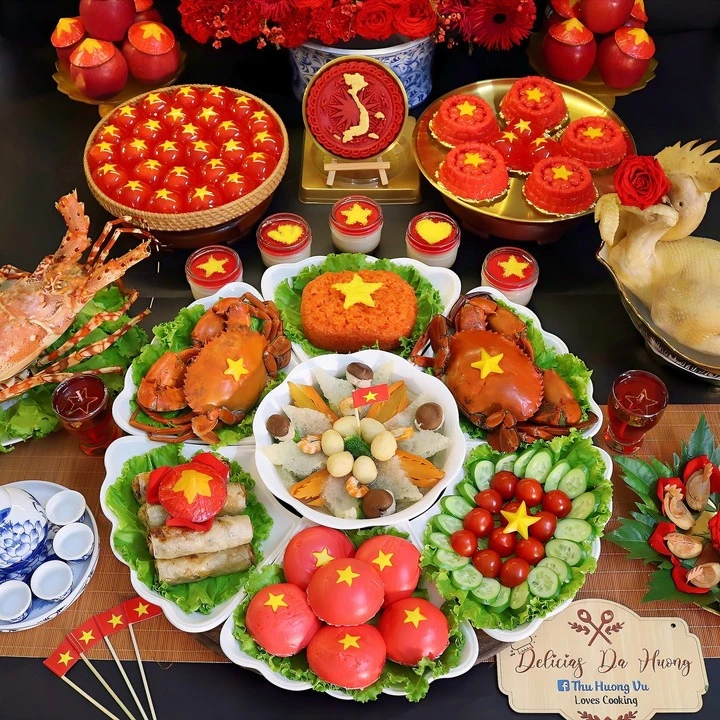 Để thực hiện, chị Hương đặc biệt chú trọng đến màu sắc và bố cục. Tông đỏ vàng được khai thác triệt để, vừa gợi nhớ đến lá cờ Tổ quốc, vừa thể hiện tinh thần đoàn kết. Trong khi đó, cách sắp xếp món ăn vẫn giữ sự quen thuộc, gần gũi của một mâm cỗ truyền thống gia đình.