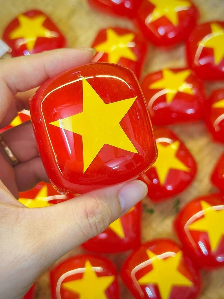 Phần lễ ngọt cũng không kém phần ý nghĩa với món bánh nướng hình bản đồ Việt Nam, chị Hương gọi là bánh “Hòa bình”, tượng trưng cho 80 năm độc lập – tự do – hạnh phúc. Bánh xu xê truyền thống được khoác lên diện mạo mới, rực rỡ sắc cờ. Thạch rau câu và bánh flan cũng theo phong cách này, mang hương vị ngọt ngào, trong trẻo như thế hệ trẻ lớn lên trong hòa bình.