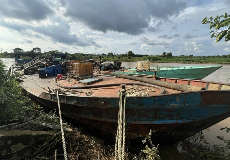 Tàu hút cát và các phương tiện liên quan mà các bị can sử dụng để khai thác cát trái phép trên sông Đồng Nai.