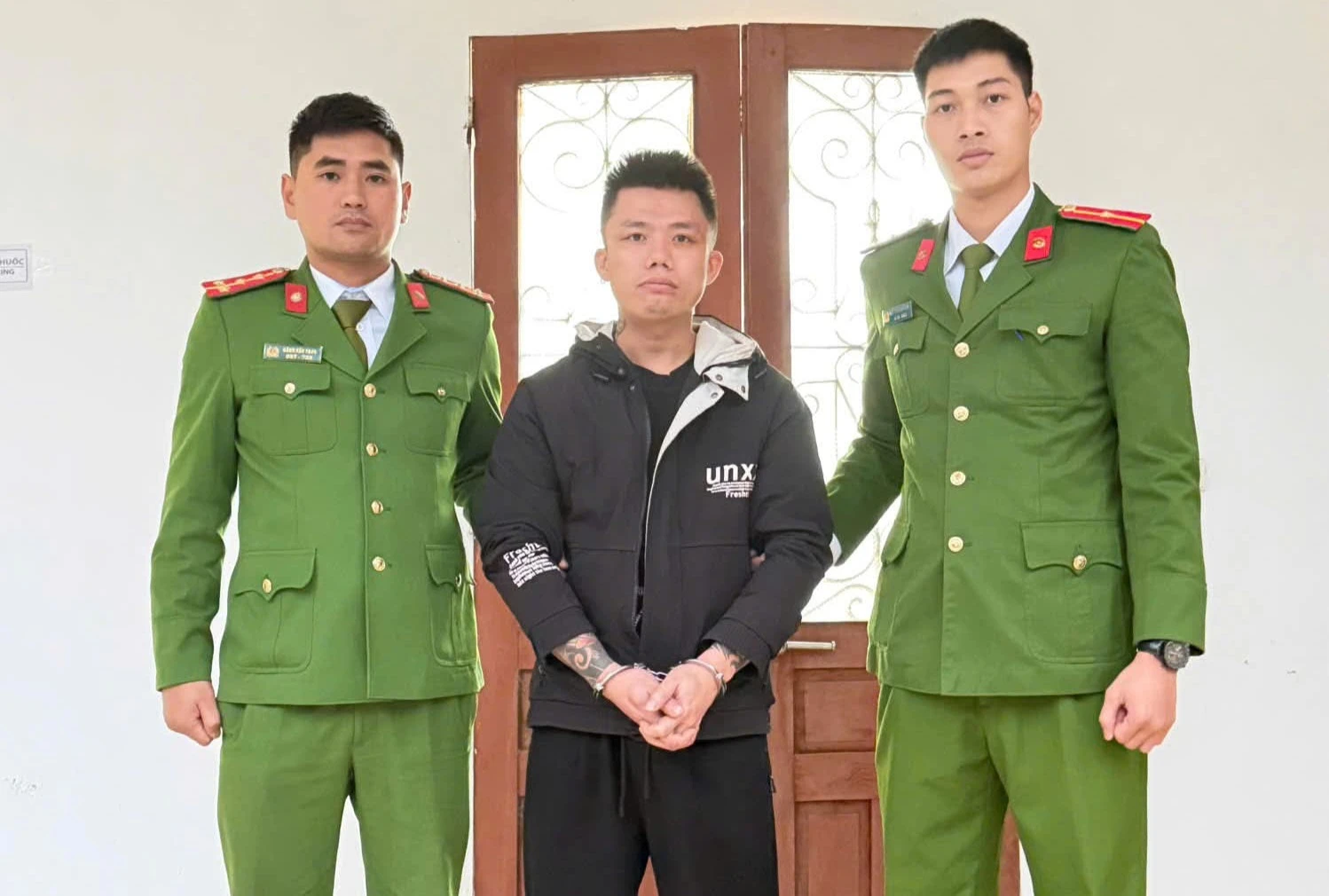 Nghi phạm Hùng (giữa) bị bắt giữ sau khi lẩn trốn vào địa bàn tỉnh Quảng Nam. Ảnh: Công an Quảng Trị