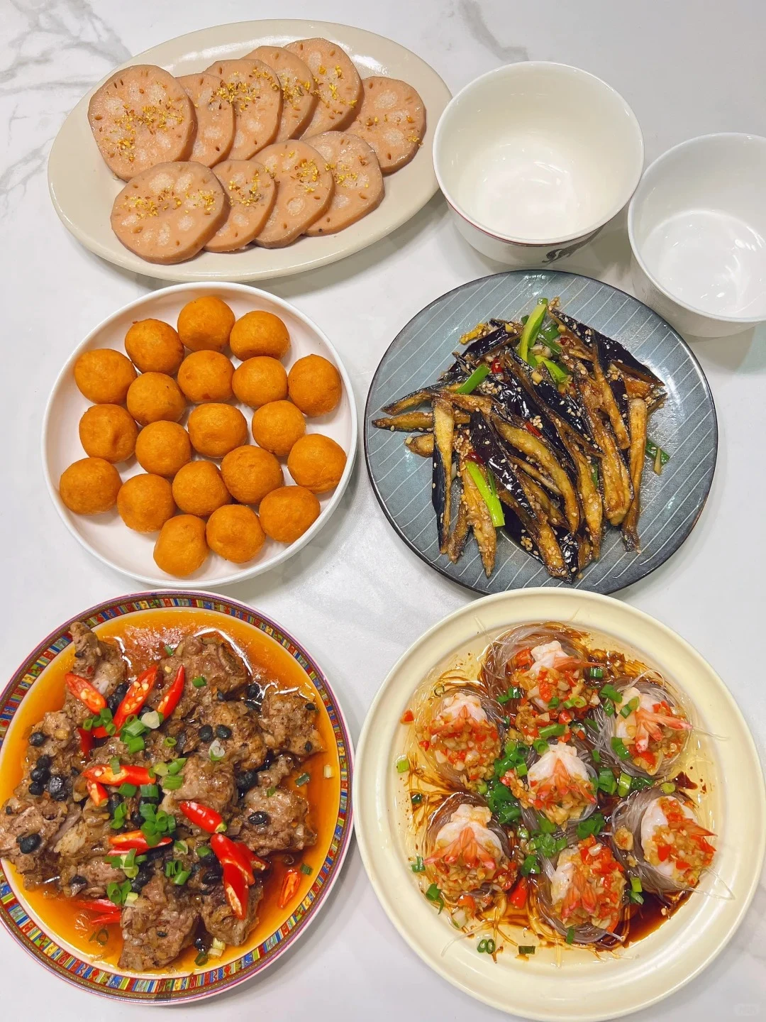 Thực đơn cơm nhà 3: Sườn hấp đậu xị, tôm hấp miến tỏi, củ sen nhồi nếp rim đường, cà tím đậm đà, viên khoai lang ngọt.