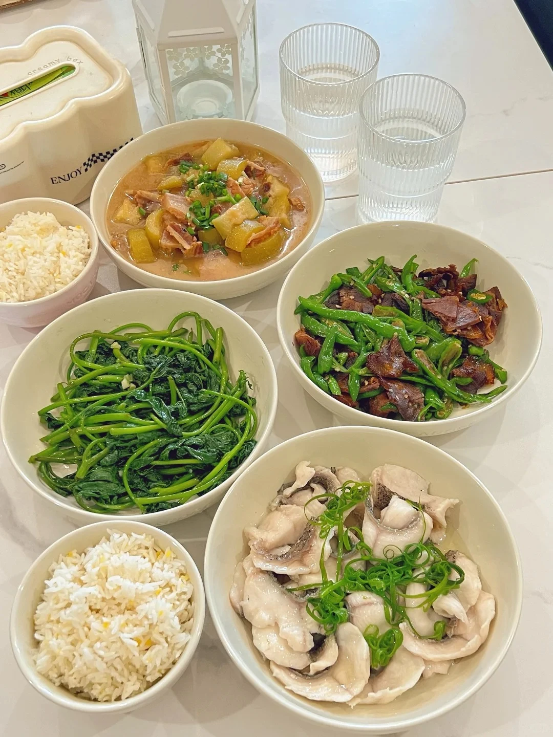 Thực đơn cơm nhà 1: Cá phi lê hấp, thịt xông khói kho bí xanh, bò kho xào ớt xanh, rau lang non xào tỏi.