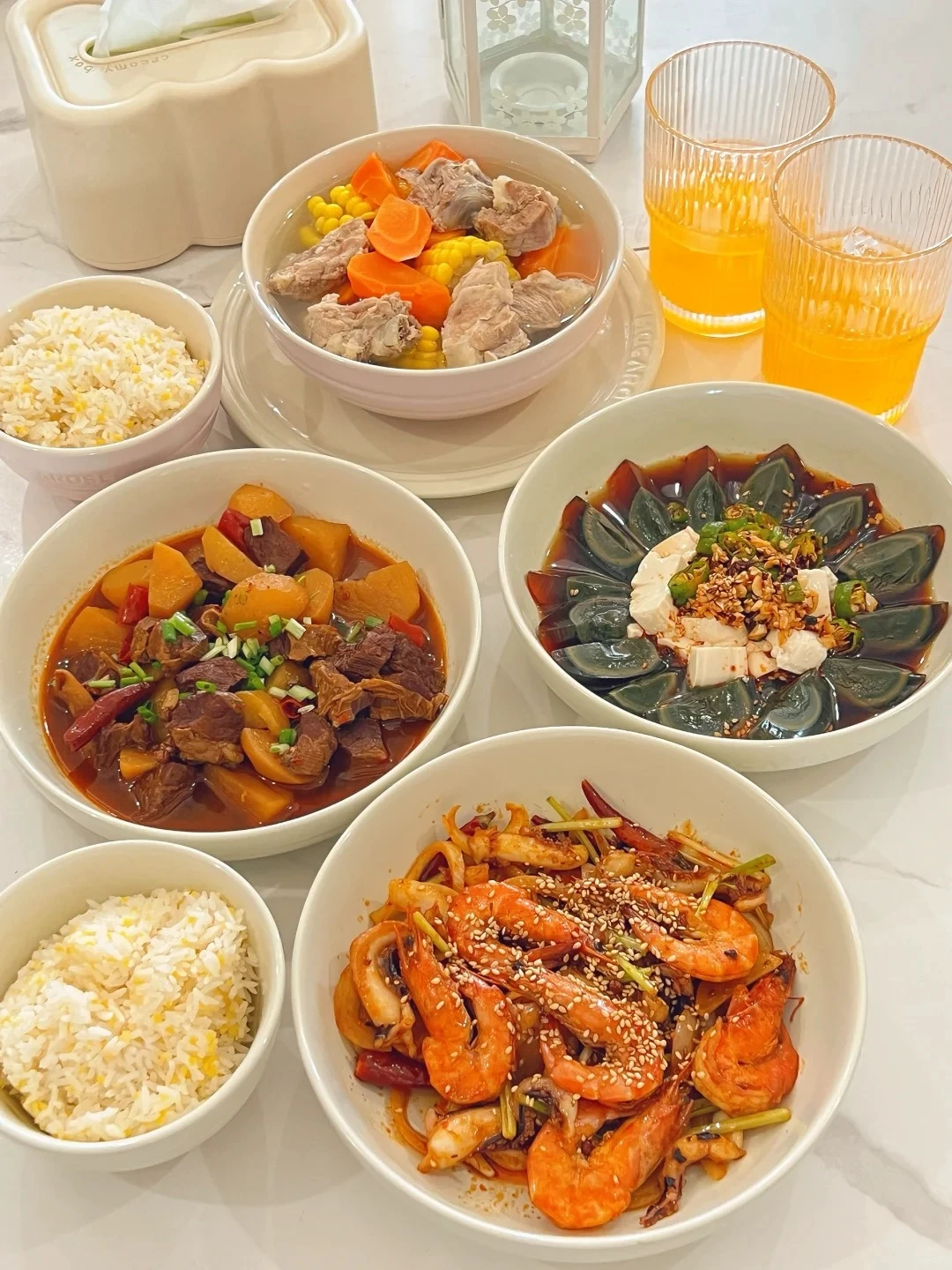 Thực đơn cơm nhà 2: Khoai tây hầm bò, mực tôm xào cay, canh sườn hầm ngô, đậu phụ trộn trứng bắc thảo.