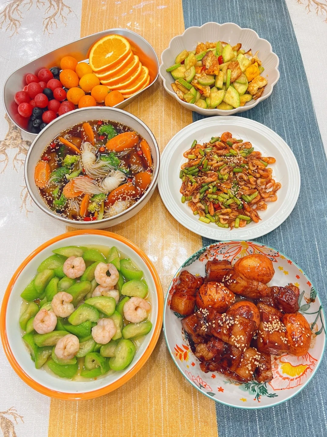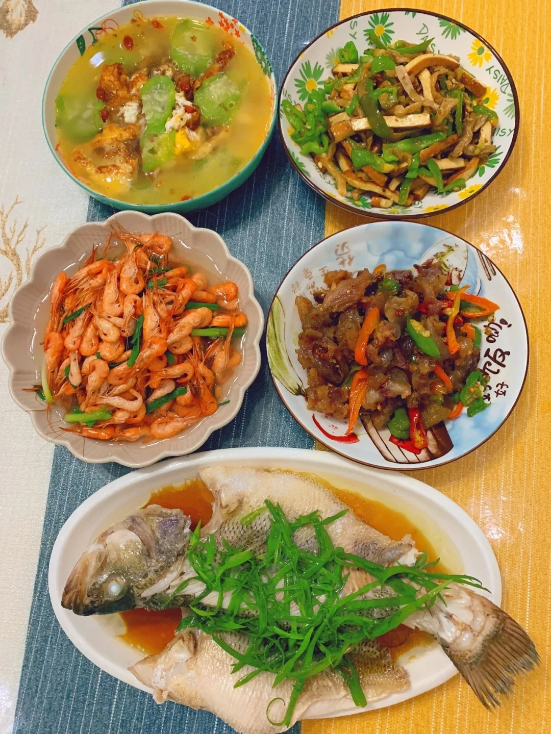 Thực đơn cơm nhà 5: Cá vược hấp, canh mướp trứng, tôm luộc, gân bò xào cay, đậu phụ khô xào thịt.