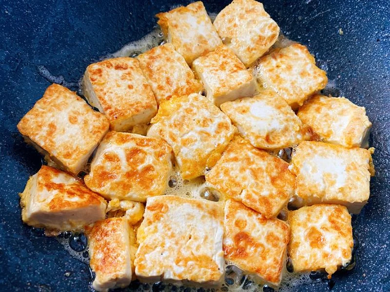 Bước 2: Đặt chảo lên bếp đun nóng rồi cho lượng dầu ăn vừa phải vào. Khi dầu nóng khoảng 80% thì bạn thả đậu phụ vào chiên cho đến khi 2 mặt có màu vàng nhạt. Lấy đậu phụ ra khỏi chảo, để lại chút dầu ăn rồi thêm tỏi băm, hành lá vào xào thơm. Sau đó cho cải thảo vào, xào mềm rồi thêm đậu phụ và nước sốt đã pha, đun nhỏ lửa trong khoảng 5 phút cho ngấm gia vị rồi tắt bếp. Cuối cùng lấy món ăn ra đĩa, rắc chút hành lá thái nhỏ lên là có thể thưởng thức.