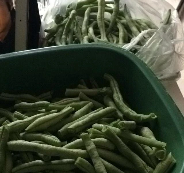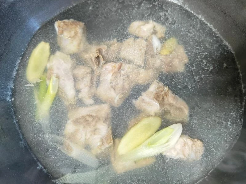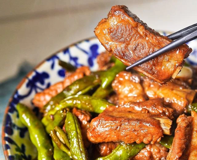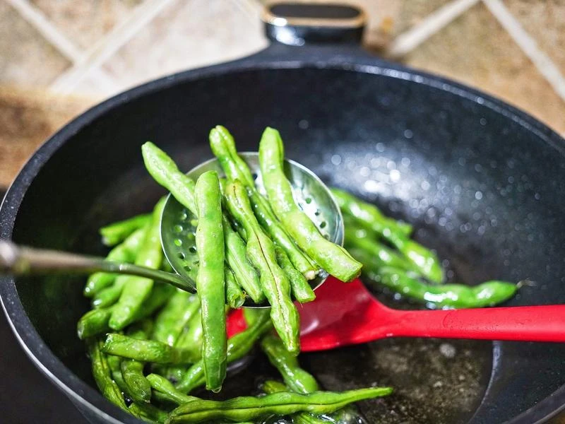 Bước 1: Rửa sạch sườn, cho vào nồi nước lạnh. Sau đó, cho gừng thái lát và rượu nấu ăn vào. Đun sôi trên lửa lớn, vớt bọt, vớt sườn ra và rửa sạch lại bằng nước ấm. Đậu cove tước bỏ xơ cạnh sau đó rửa sạch, bẻ thành các đoạn ngắn. Sau đó đặt chảo lên bếp, thêm dầu ăn vào đun nóng rồi trút đậu cove vào xào nhanh đến khi chuyển màu xanh đậm. Vớt đậu ra để riêng.