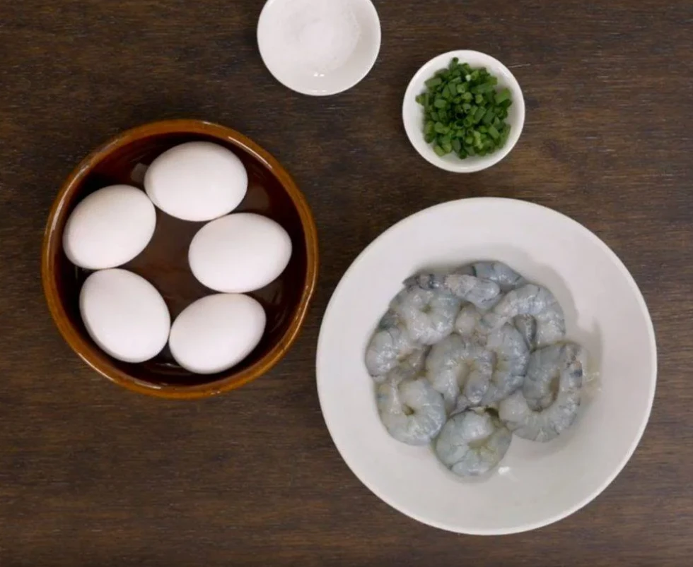250g tôm tươi, 4 quả trứng gà, một chút muối, 1 thìa canh rượu nấu ăn, hành lá thái nhỏ.