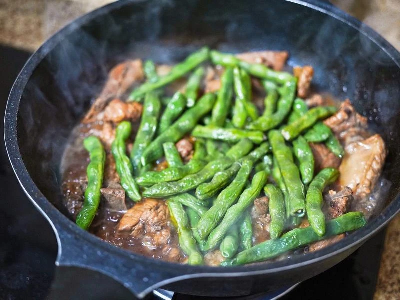 3. Bò kho xào ớt xanh: Thịt bò kho được thái lát, xào nhanh tay cùng ớt xanh, thêm chút hành tỏi phi thơm. Vị ngọt đậm của bò hòa với độ giòn cay của ớt xanh tạo nên một món ăn vừa bắt mắt vừa kích thích vị giác. Chỉ vài phút chế biến nhưng hương thơm lan tỏa đã khiến mâm cơm thêm phần hấp dẫn.