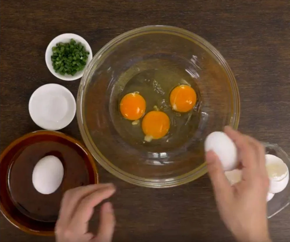 Bước 1: Rửa sạch tôm rồi dùng khăn bếp thấm khô nước. Bóc vỏ và loại bỏ chỉ tôm sau đó cho vào bát và ướp với một chút xíu muối cùng rượu nấu ăn. Đập trứng gà vào bát, thêm chút muối và 1 thìa canh nước, đánh đều.