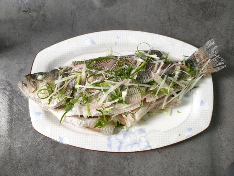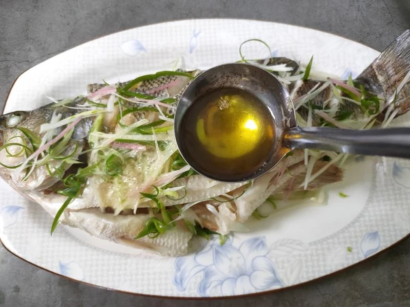 Bước 2: Đổ nước vào nồi hấp và đun sôi. Sau đó đặt đĩa cá lên xửng và hấp ở lửa lớn trong khỏng 10-15 phút (điều chỉnh thời gian tùy theo kích cỡ cá). Sau đó bạn dùng dụng cụ lấy đĩa cá ra, chắt phần nước đọng xuống đĩa. Tiếp đó xếp hành lá và gừng thái nhỏ lên cá, rưới nước tương hấp lên trên và rưới dầu nóng vào để kích thích mùi thơm.