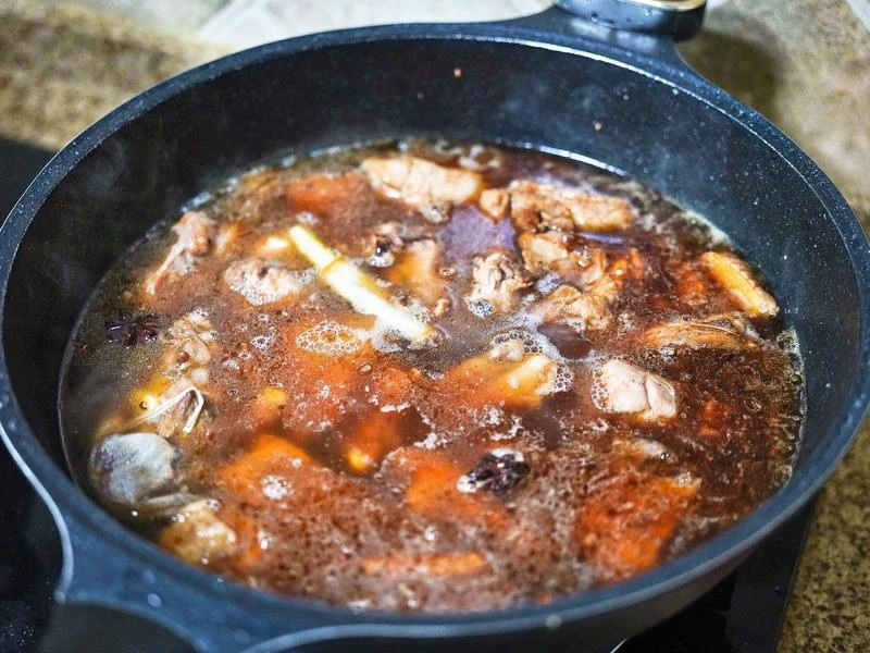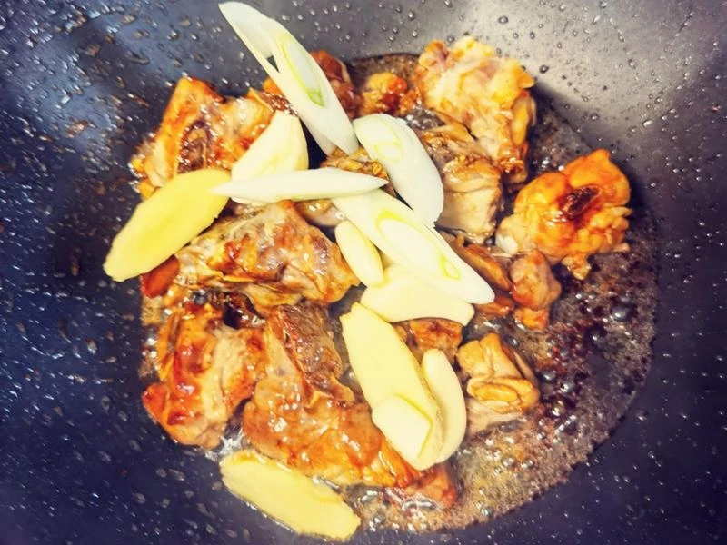 Bước 2: Để lại một chút dầu trong chảo, đun nóng sau đó thêm đường phèn vào, đảo đều trên lửa nhỏ đến khi đường tan hết, chuyển sang màu nâu nhạt (chú ý để lửa nhỏ tránh bị cháy). Sau đó cho sườn đã chần vào xào đến khi ngấm đều đường. Tiếp đó bạn cho hoa hồi, hạt tiêu, quế, lá nguyệt quế, nước tương, nước tương đen, rượu nấu ăn, một chút muối và bột nêm vào, xào đều cho ngấm.