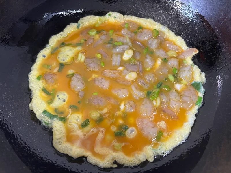 Bước 2: Thêm chút dầu ăn vào chảo, khi dầu nóng thì cho tôm đã ướp vào xào cho đến khi chuyển màu. Sau đó lấy tôm ra đĩa, để riêng. Tiếp đó bạn thêm chút xíu dầu ăn vào chảo, đun nóng rồi cho trứng vào, đợi trứng hơi đông lại thì thêm tôm vào rồi rắc hành lá thái nhỏ vào rồi xào đều. Khi các nguyên liệu chín bạn lấy ra đĩa và thưởng thức.