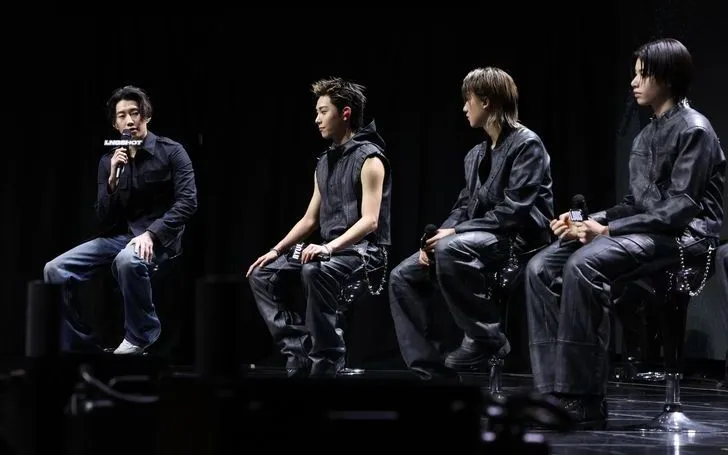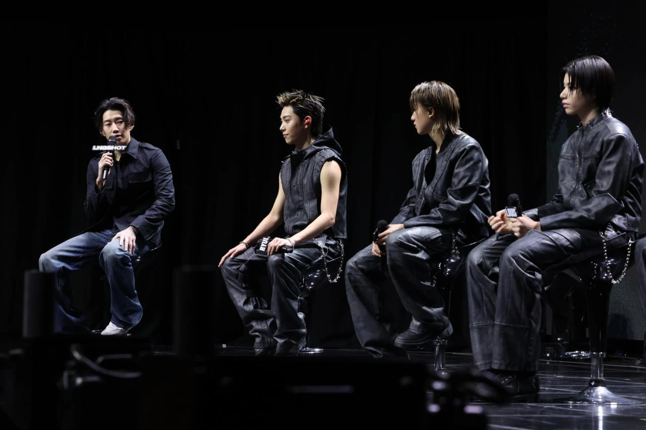 Ca sĩ Jay Park (ngoài cùng bên trái) phát biểu trước giới truyền thông trong buổi showcase ra mắt của nhóm nhạc nam LNGSHOT tại MyungHwa Live Hall ở Seoul. (Ảnh: Yonhap)