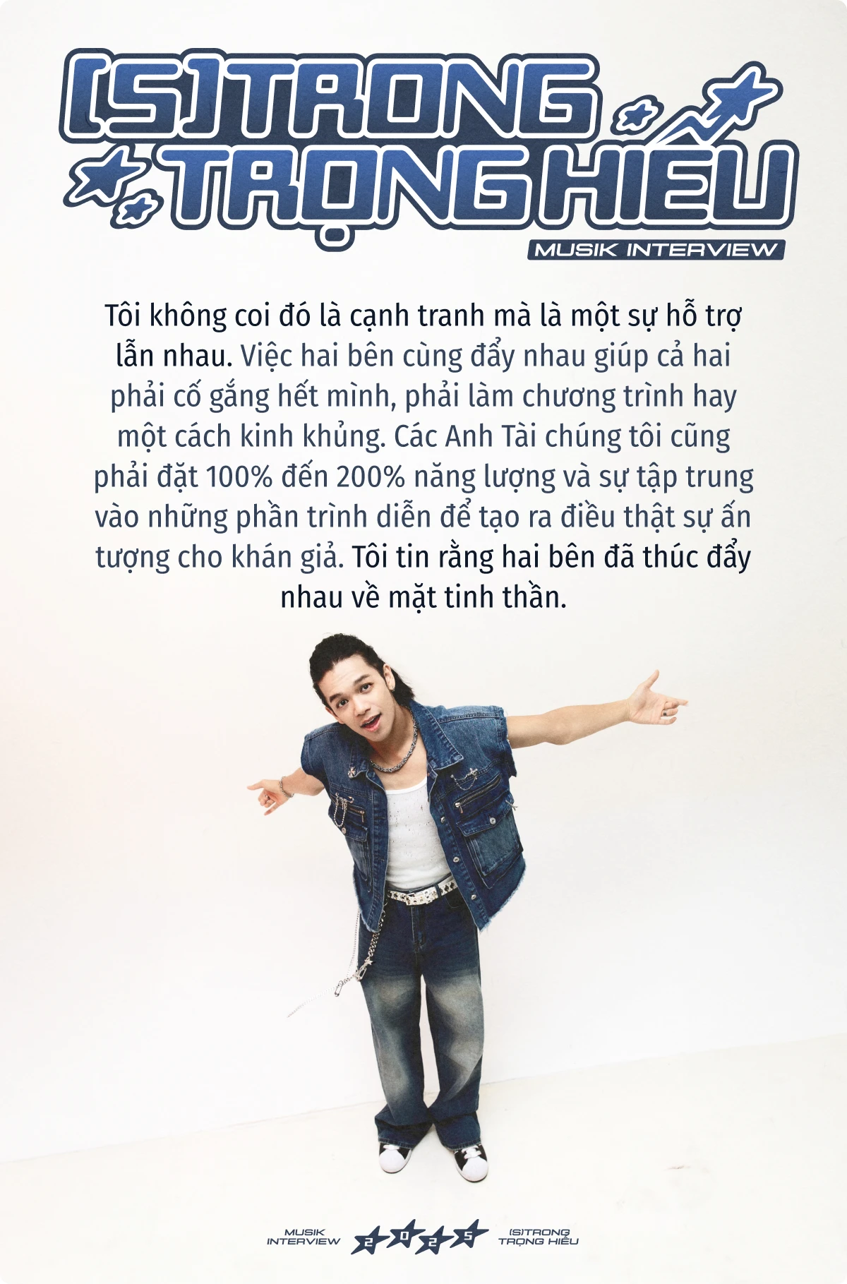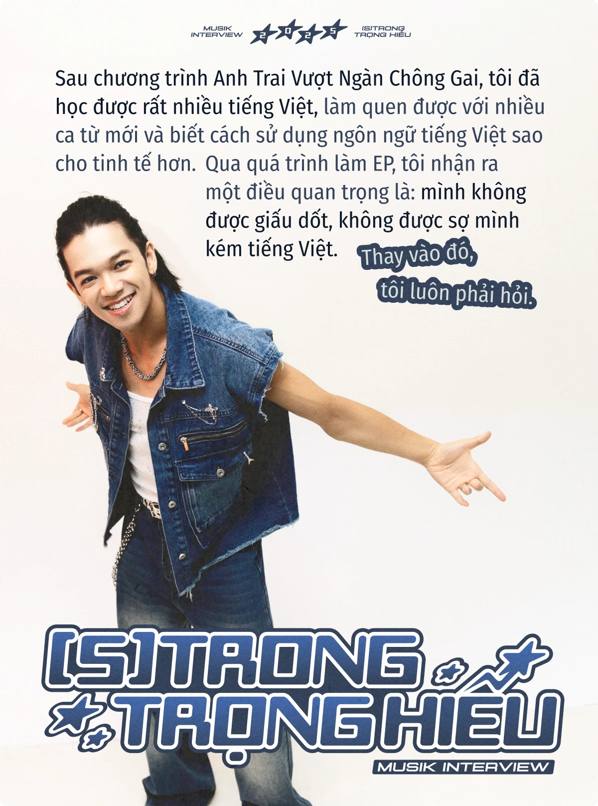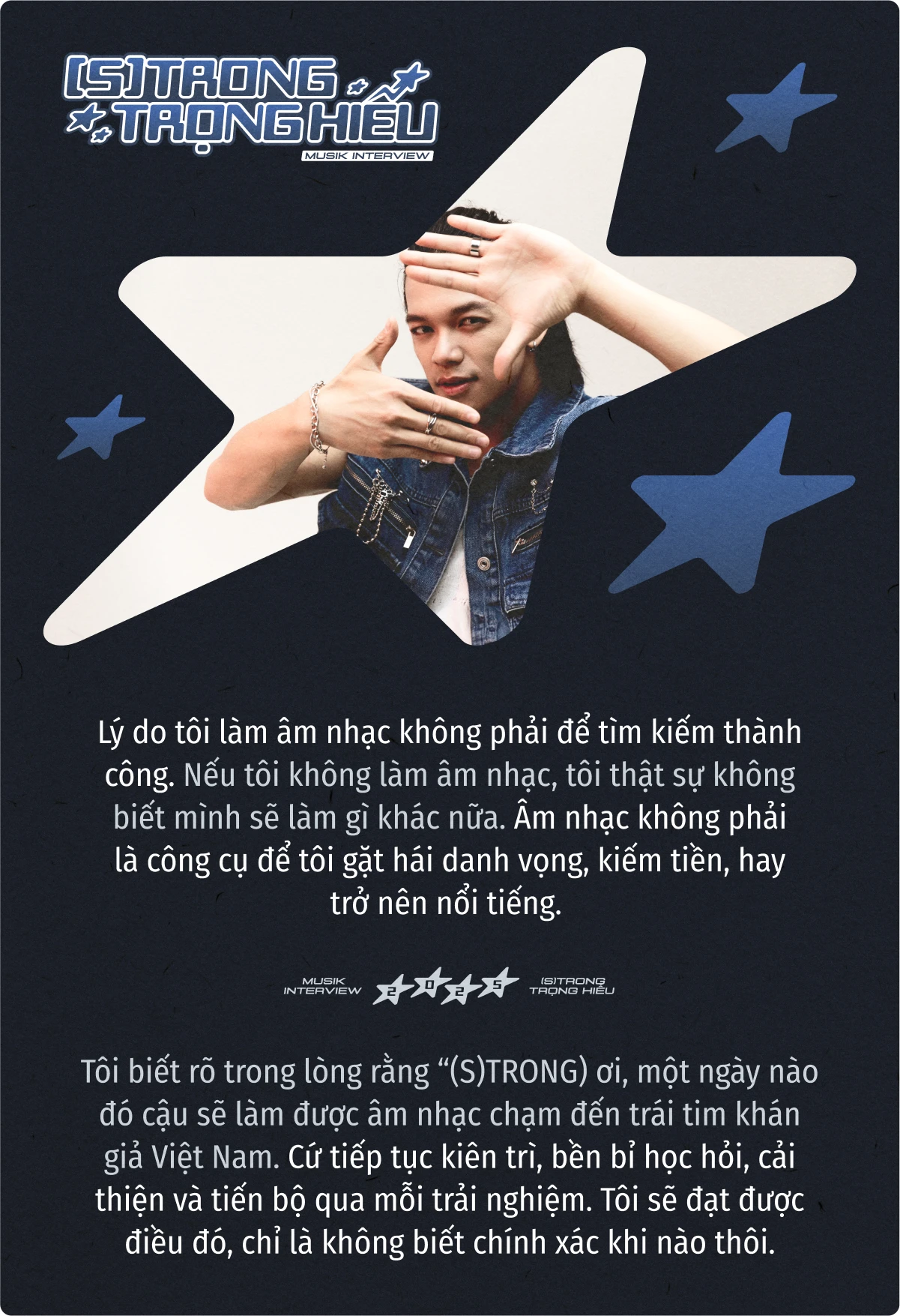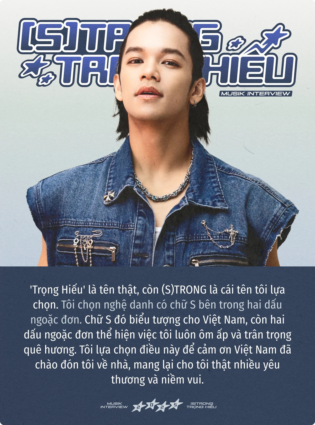 Trong cuộc trò chuyện này, (S)TRONG mở lòng về thành công và cả áp lực. Trọng Hiếu kể về việc đổi nghệ danh thành (S)TRONG. Chữ " S" trong tên mới không chỉ là viết tắt của "Strong" - mạnh mẽ, mà còn là biểu tượng cho "S-shaped Vietnam" - hình chữ S của quê hương, nơi anh luôn hướng về dù đi xa đến đâu. 10 năm làm nghề, (S)TRONG giữ cho mình hình ảnh sạch, một con đường rõ ràng và sự kiên định đáng quý.