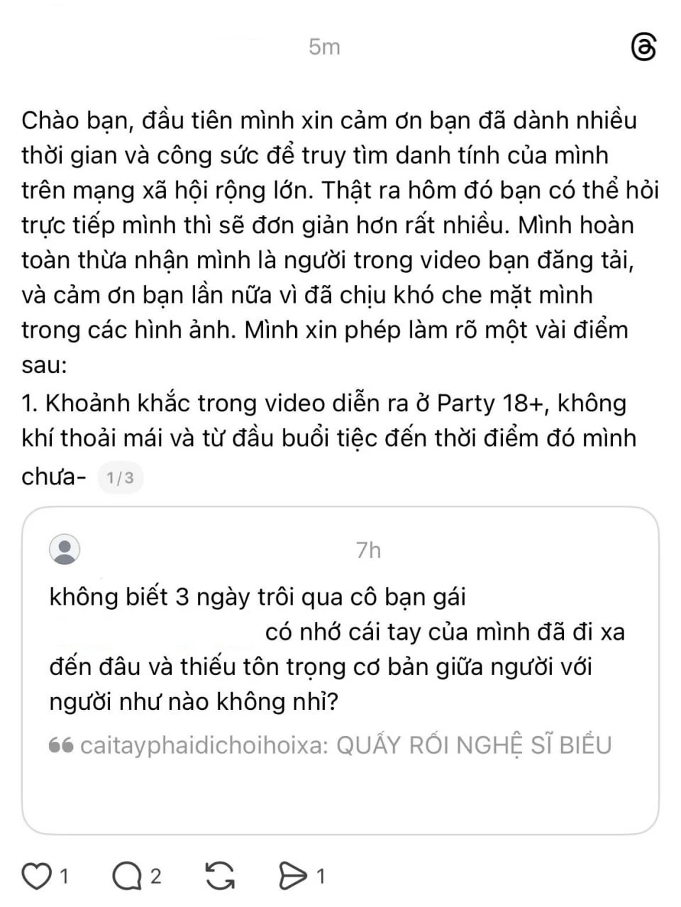 Trước làn sóng tấn công dữ dội từ cộng đồng mạng, tài khoản mạng xã hội của được cho là của nữ khán giả xuất hiện trong clip đã nhanh chóng được tìm ra. Thay vì chọn cách im lặng hoặc đưa ra lời xin lỗi chân thành để xoa dịu dư luận, tài khoản này đã đăng tải một bài viết đính chính trên trang cá nhân với nội dung gây tranh cãi không kém hành động trước đó. Cụ thể, trong bài viết giải thích của mình, cô cho rằng hành vi đụng chạm cơ thể của mình đối với (S)TRONG không hề khiến nam ca sĩ cảm thấy khó chịu.