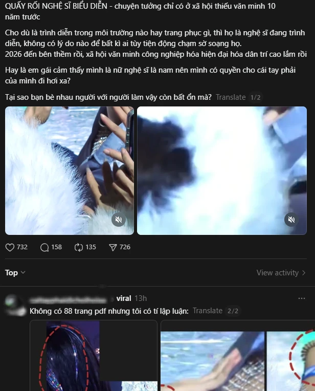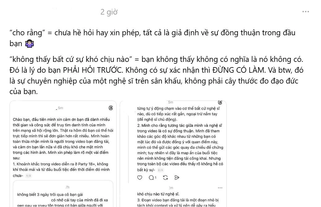 Ngày 2/12, một bài đăng lan truyền với tốc độ chóng mặt trên nền tảng mạng xã hội Threads với nội dung tố cáo thẳng thừng hành vi quấy rối của một khán giả đối với một nam ca sĩ đang biểu diễn trên sân khấu. Theo những hình ảnh được ghi lại, trong lúc nam ca sĩ đang tập trung vào phần trình diễn của mình và di chuyển đến gần khu vực khán giả để giao lưu, một cô gái đã có hành vi đưa tay tiếp xúc trực tiếp, thậm chí sờ mó vào cơ thể của nghệ sĩ này. Hành động táo bạo và thiếu kiểm soát này diễn ra trong một khoảng thời gian đủ dài để các camera xung quanh ghi lại trọn vẹn, tạo nên một làn sóng phẫn nộ dữ dội trong cộng đồng người hâm mộ.