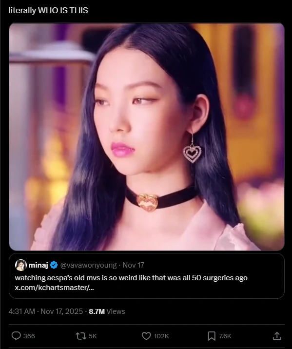 Mới đây, không hiểu vì lý do gì mà một tài khoản X đã đăng tải hình ảnh kém sắc của Karina thời mới debut, và một lần nữa MXH lại bùng lên cãi cọ. Bức ảnh này được cắt ra từ MV Black Mamba , còn Karina có phần khác lạ so với hiện tại. Dễ nhận thấy khuôn mặt không thanh thoát và thon gọn như bây giờ; đôi mắt thì to tròn hơn; sống mũi cũng cao hơn. Nếu so sánh Karina ở 2020 với 2025, dân tình không khó để chỉ ra những điểm khác biệt rõ rệt rằng quá khứ của nữ idol không thật sự long lanh như hiện tại.