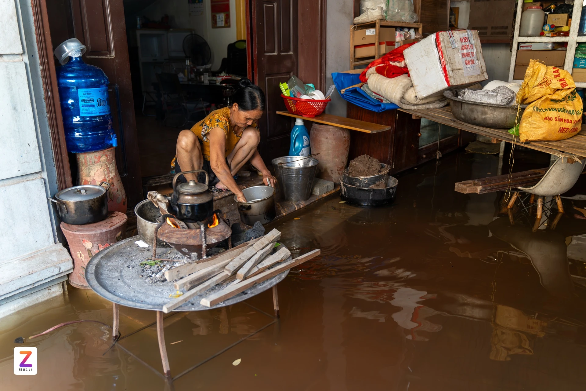 Người dân tại ngách 6/153 Miêu Nha phải nấu bếp củi giữa cảnh mất nước, mất điện, nước ngập bao quanh.