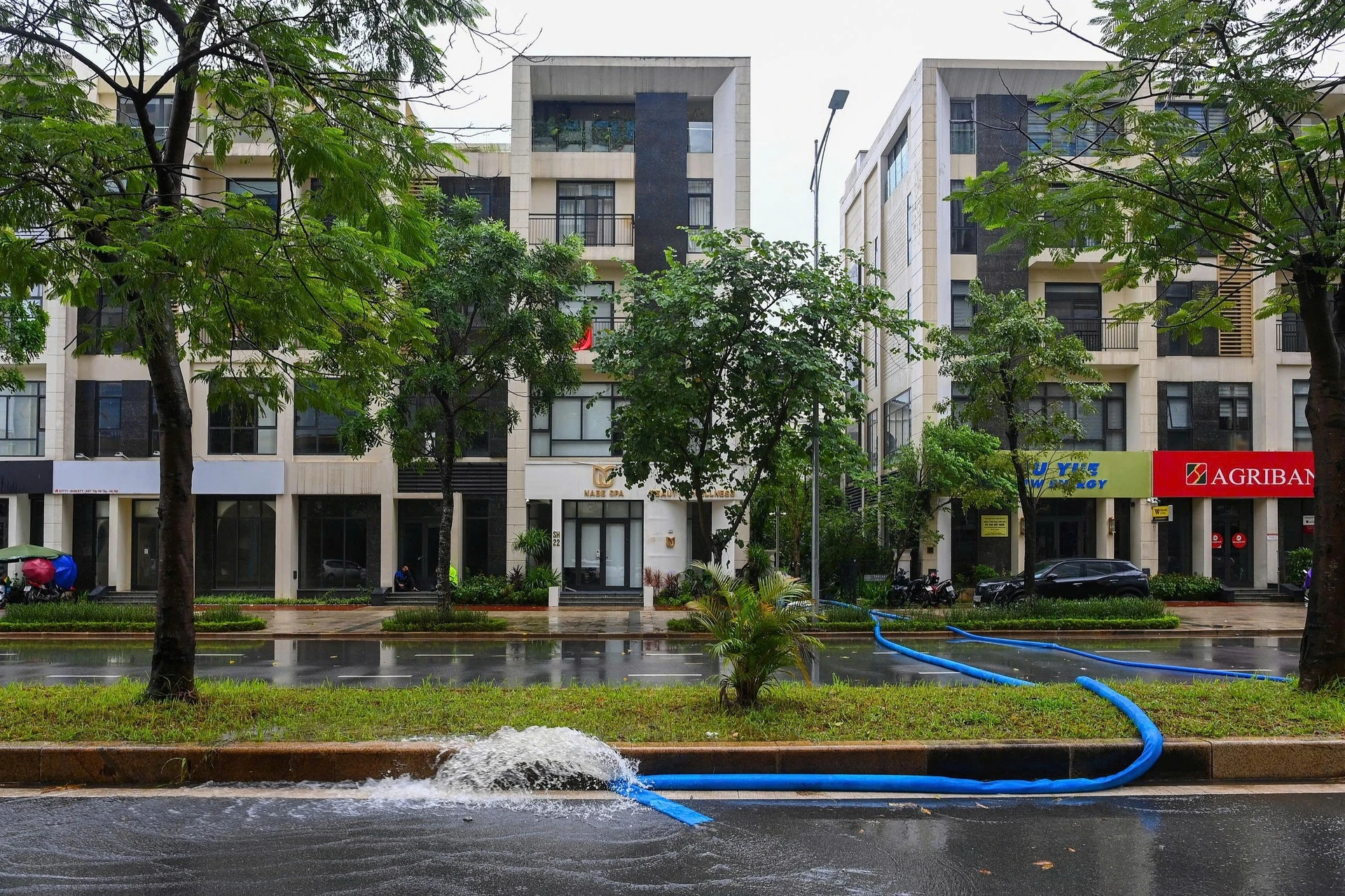 Nhiều máy bơm công suất cao được huy động để bơm thoát nước lũ ra khỏi khu vực các căn biệt thự.
