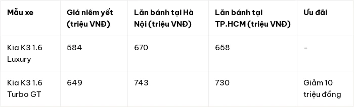 Hiện tại, Kia K3 được lắp ráp trong nước và phân phối với nhiều phiên bản, đáp ứng đa dạng nhu cầu từ chạy dịch vụ đến trải nghiệm lái thể thao. Đáng chú ý, phiên bản cao cấp nhất 1.6 Turbo GT đang nhận được ưu đãi giảm giá trực tiếp 10 triệu đồng.