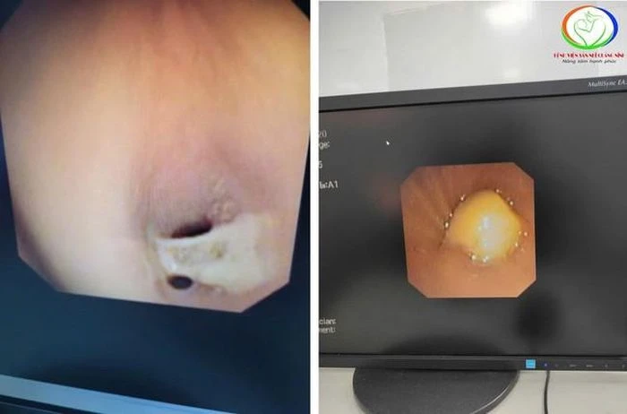 Ở bệnh nhi Đ.M.A, các bác sĩ phát hiện mảnh xương cá kích thước 1,5 x 1 cm mắc trong khí quản, cách dây thanh khoảng 3 cm, gây xung huyết niêm mạc, xuất hiện dịch và phù nề thanh quản.