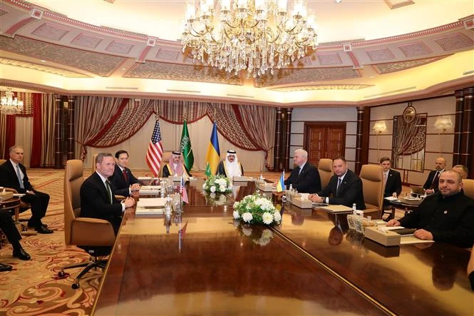 Phái đoàn Mỹ và Ukraine trong cuộc đàm phán tại Jeddah, Saudi Arabia, ngày 11/3/2025. Ảnh: THX/TTXVN