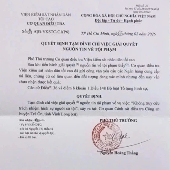 Cơ quan điều tra VKSND Tối cao đã tiến hành giải quyết tố giác tội phạm nêu trên. Kết quả, quá trình giải quyết, đơn vị đã gửi công văn đến các ngân hàng đề nghị cung cấp tài liệu, chứng cứ có liên quan đến đối tượng đang xác minh. Do thời hạn giải quyết tố giác tội phạm đã hết nhưng vẫn chưa nhận được đầy đủ tài liệu làm căn cứ để ra quyết định khởi tố vụ án hình sự hoặc quyết định không khởi tố vụ án hình sự, nên ngày 6/2, Cơ quan điều tra VKSND Tối cao đã ban hành quyết định tạm đình chỉ giải quyết nguồn tin tội phạm để chờ kết quả nêu trên.