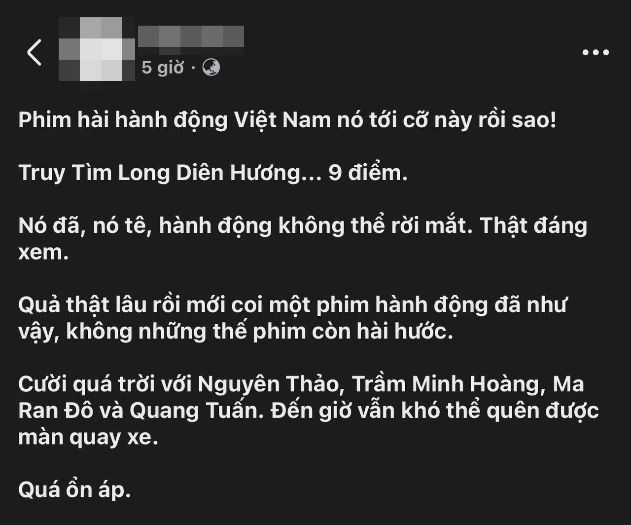 Trong làn sóng phim kinh dị khiến màn ảnh rộng Việt “ngợp thở”, Truy Tìm Long Diên Hương xuất hiện như một chuyến giải phóng năng lượng lý tưởng. Dự án của đạo diễn Dương Minh Chiến kết hợp yếu tố hành động, hài hước, giật gân cùng văn hóa làng biển, đã có buổi chiếu sớm dành cho giới truyền thông. Qua đó, phim nhận về nhiều đánh giá tốt, vượt xa mong đợi so với những đoạn trailer chưa thật sự hấp dẫn trước đó.