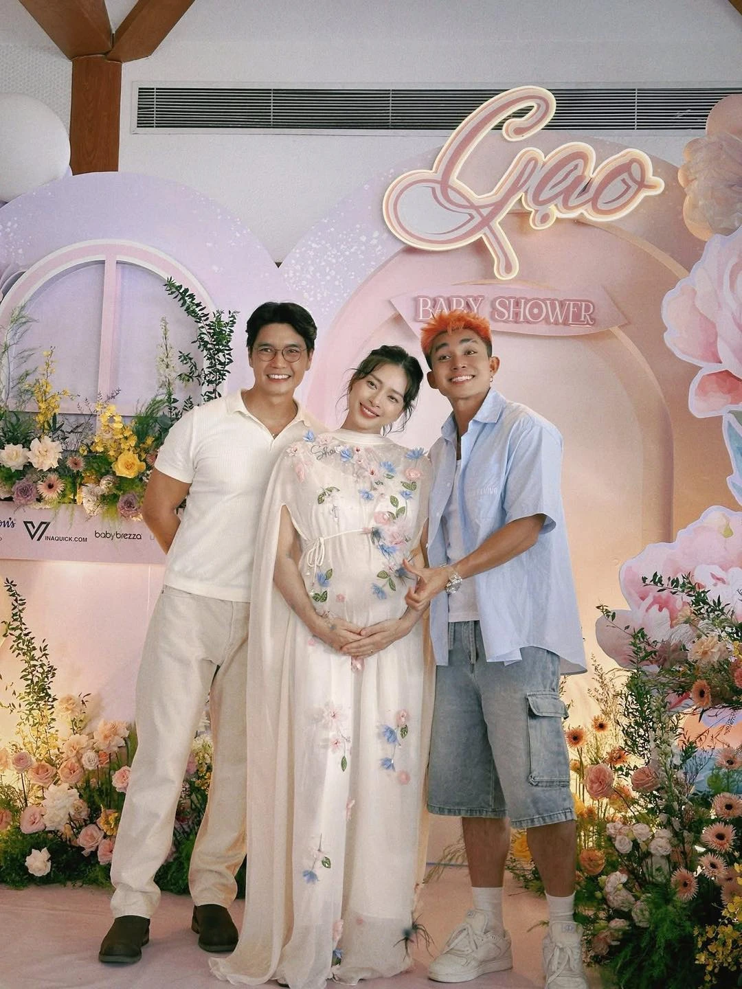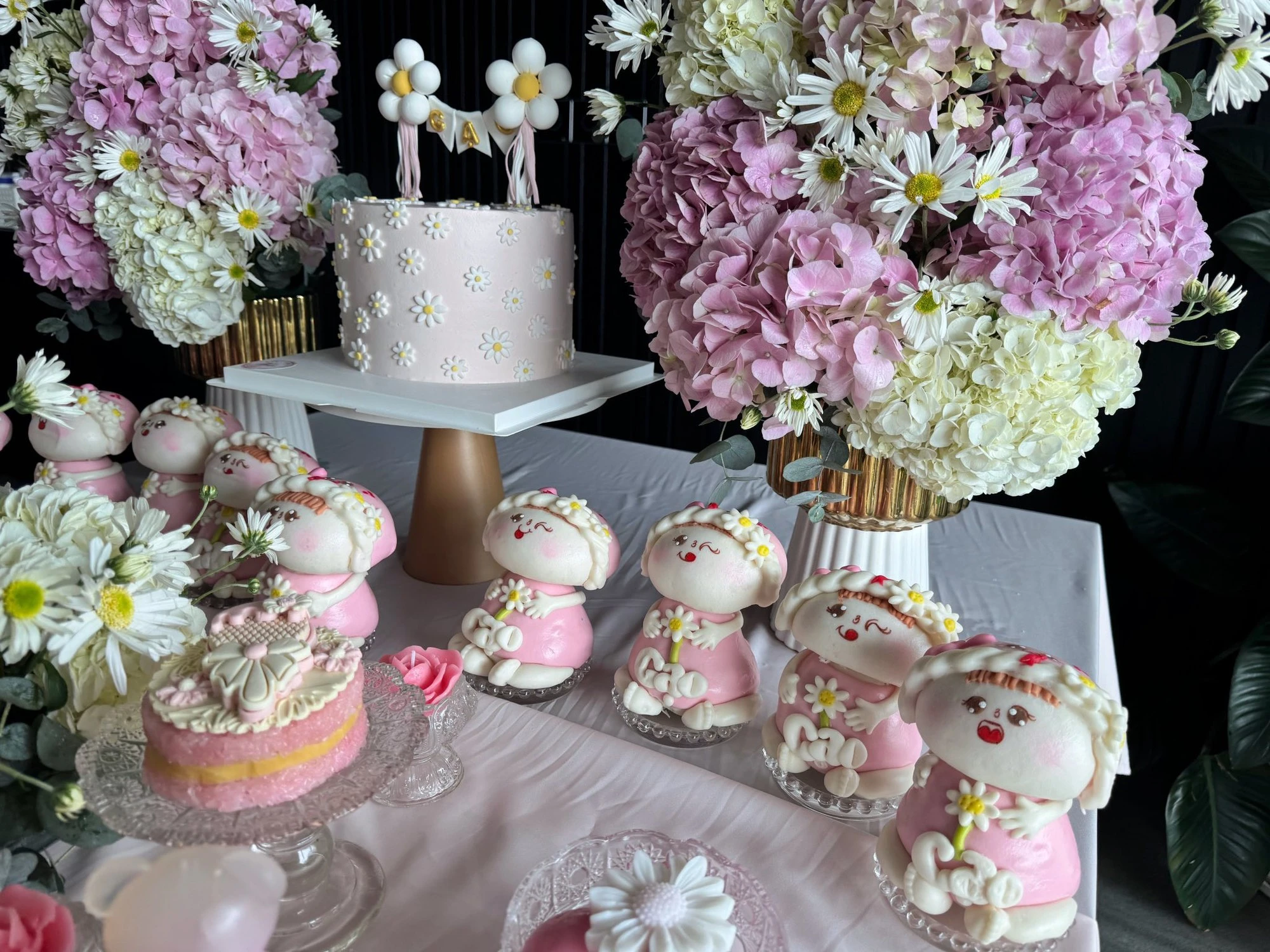 Điểm nhấn trong buổi lễ chính là bàn tiệc phủ tràn sắc hồng pastel với thiết kế đồng điệu và tinh tế. Những chiếc cupcake nhỏ xinh, bánh kem hoa cúc, tháp donut trang trí nơ hồng, và chiếc bánh lớn mang tên Gạo được bày biện đẹp mắt. Xung quanh còn có những tạo hình ngộ nghĩnh của em bé má hồng, khiến không gian thêm phần đáng yêu.