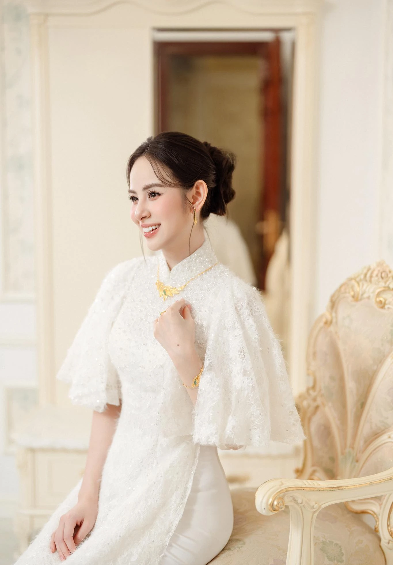 Trong ngày trọng đại, Hương Liên diện chiếc áo dài trắng được thiết kế riêng, tôn lên nét đẹp dịu dàng, thanh tú của cô dâu mới. Hương Liên trang điểm và làm tóc nhẹ nhàng nhưng cũng đã rất xinh đẹp và cuốn hút. Đặc biệt, thứ gây chú ý không kém visual nức nở của cô dâu chính là bộ sính lễ. Theo đó, bộ trang sức Hương Liên đeo trong lễ đón dâu có giá hơn 200 triệu đồng.