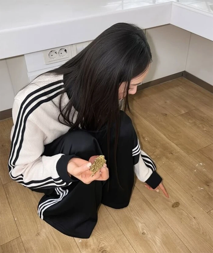 Tuy nhiên, điểm nhấn thật sự lại nằm ở những bức ảnh tiếp theo. Trong lúc cầm bánh, một phần cookie bất ngờ rơi xuống sàn, tạo nên tình huống dở khóc dở cười. Lee Da Hee sau đó ngồi xổm xuống, dùng ngón tay chỉ vào mẩu bánh rơi trên đất, gương mặt lộ rõ vẻ bối rối và… suy tư như đang cân nhắc điều gì đó. Khoảnh khắc này lập tức khiến người xem bật cười bởi sự đối lập hoàn toàn với hình ảnh chỉn chu thường thấy của cô.