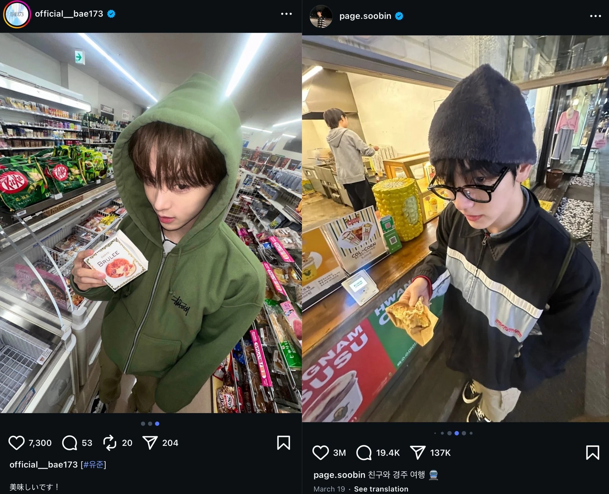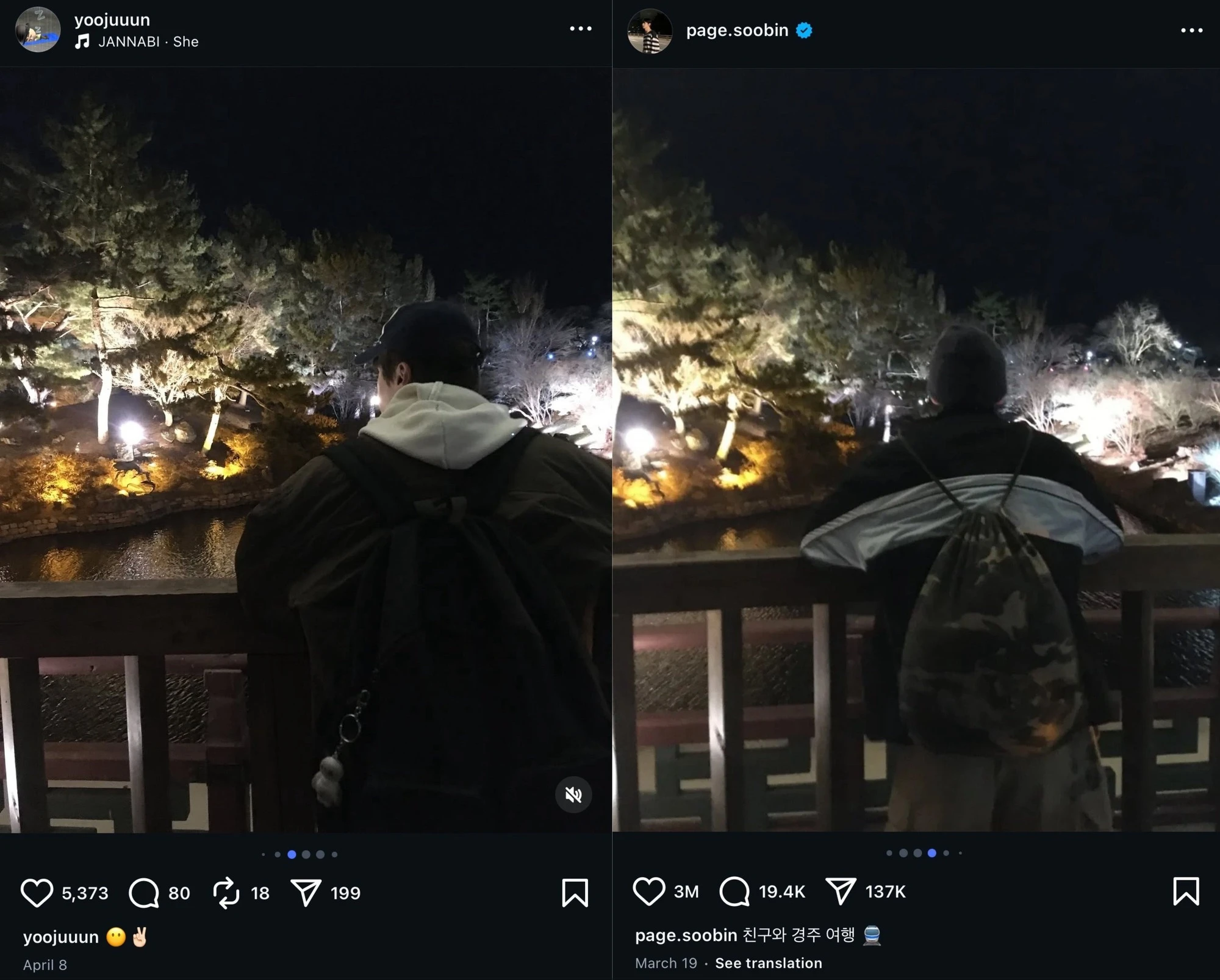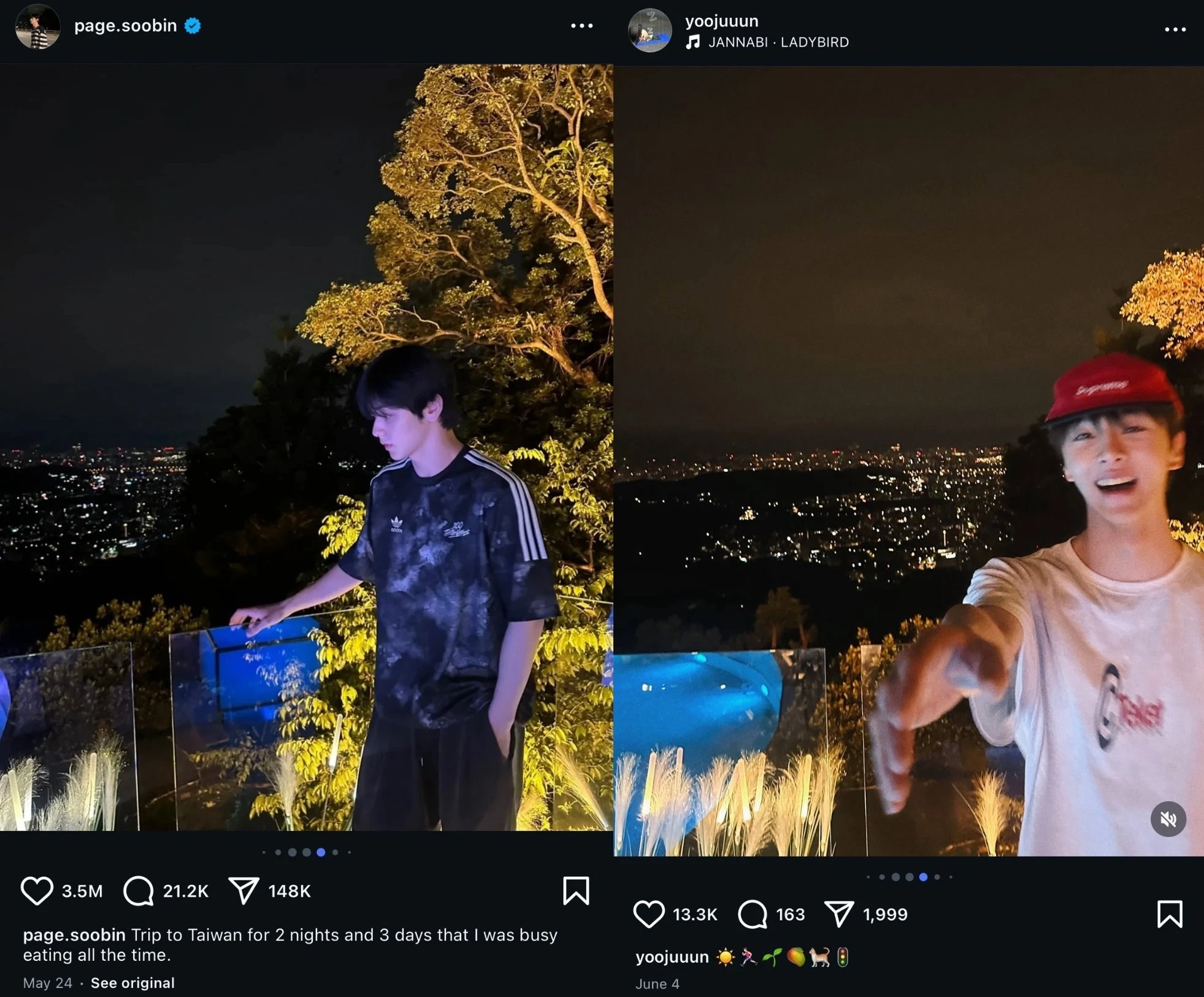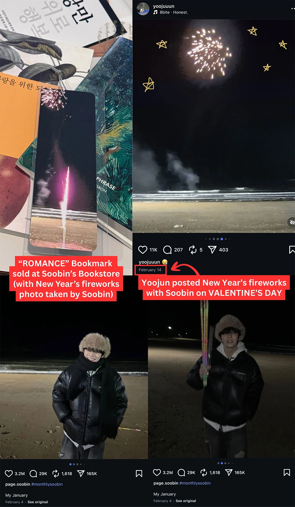 Theo đó, chủ nhân bài đăng hé lộ ảnh Soobin – Yoojun cùng đi du lịch Đài Loan (Trung Quốc) và Gyeongju (Hàn Quốc). Trong những chuyến đi này, có vẻ như họ đã ngủ chung giường. Soobin màn bắn pháo hoa đêm giao thừa là “lãng mạn”, Yoojun đăng tải hình ảnh pháo hoa vào ngày Valentine. Ngoài ra, họ còn có phụ kiện đôi và “lovestagram”, check-in cùng chỗ giống nhiều cặp đôi khác.