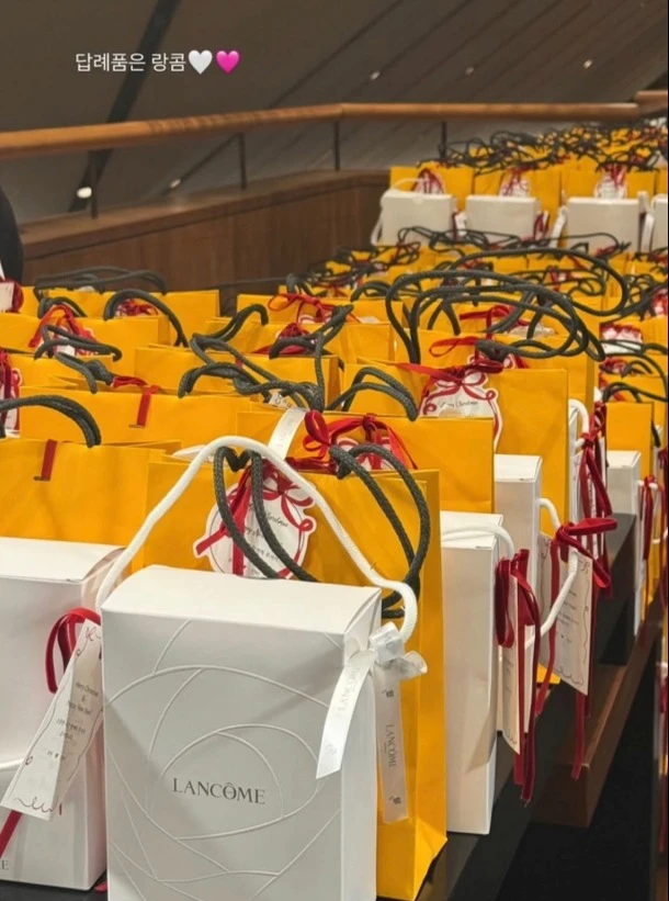 Các vị khách đến tham dự đám cưới được cho là nhận được 2 túi quà trắng và vàng. Trong đó, túi quà màu trắng đến từ thương hiệu Lancôme, túi quà còn lại được tiết lộ là sản phẩm của hãng nước hoa xa xỉ Acqua di Parma. Tổng giá trị của hàng trăm phần quà mà Shin Min Ah - Kim Woo Bin chuẩn bị cho khách mời ước tính lên tới hàng trăm triệu won (tương đương hàng tỷ đồng).