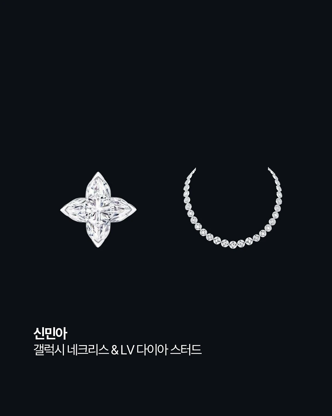 Trang sức của Shin Min Ah cũng thuộc dòng high-end đến từ LV. Chiếc vòng cổ của nữ diễn viên được chế tác từ vàng trắng 18K đính kim cương. Tổng cộng món trang sức này sử dụng 20 viên kim cương cắt navette cùng 452 viên kim cương tổng trọng lượng 7,98 carat và có mức giá khoảng 350 triệu won (hơn 6,1 tỷ đồng). Đôi bông tai cùng thương hiệu cũng có giá đến 35 triệu won (600 triệu đồng) mỗi chiếc, nghĩa là 1 cặp hoa tai của Shin Min Ah có giá trị đến 1,2 tỷ đồng. Trong khi đó, chiếc nhẫn cưới được cho là của Kim Woo Bin có giá khoảng 17 triệu won (323 triệu đồng).