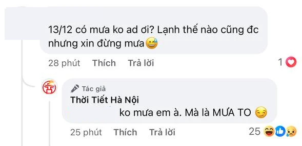 Admin trang fanpage Thời Tiết Hà Nội cũng cho biết trong ngày 13/12, dự báo sẽ có mưa to