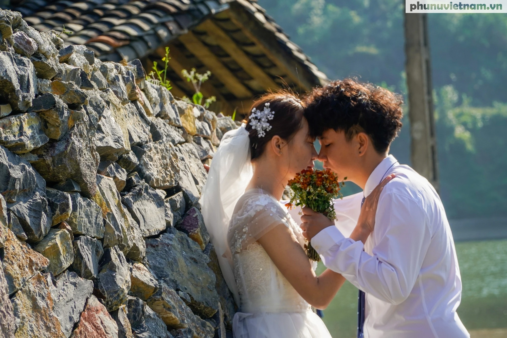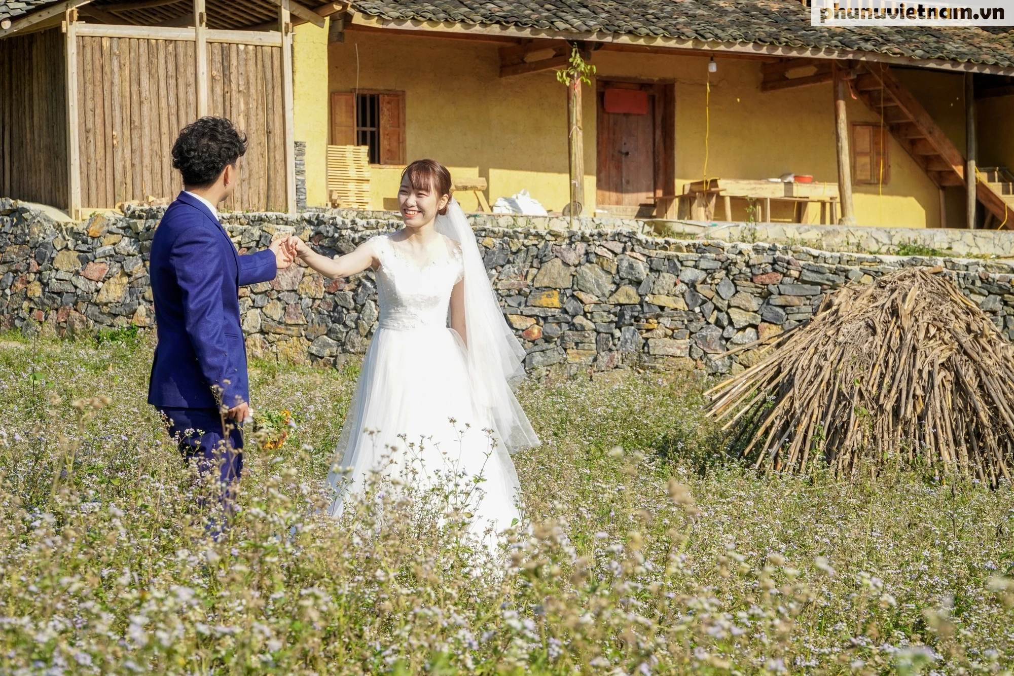 Hoa tam giác mạch nở rộ phủ thảm mùa thu, làm mềm lối vào bản, gọi bước chân phương xa nhưng nhịp nhà vẫn chậm rãi. Nhiều đôi uyên ương tìm đến chụp ảnh cưới trước tường đất, rào đá của những nếp nhà Lô Lô Chải