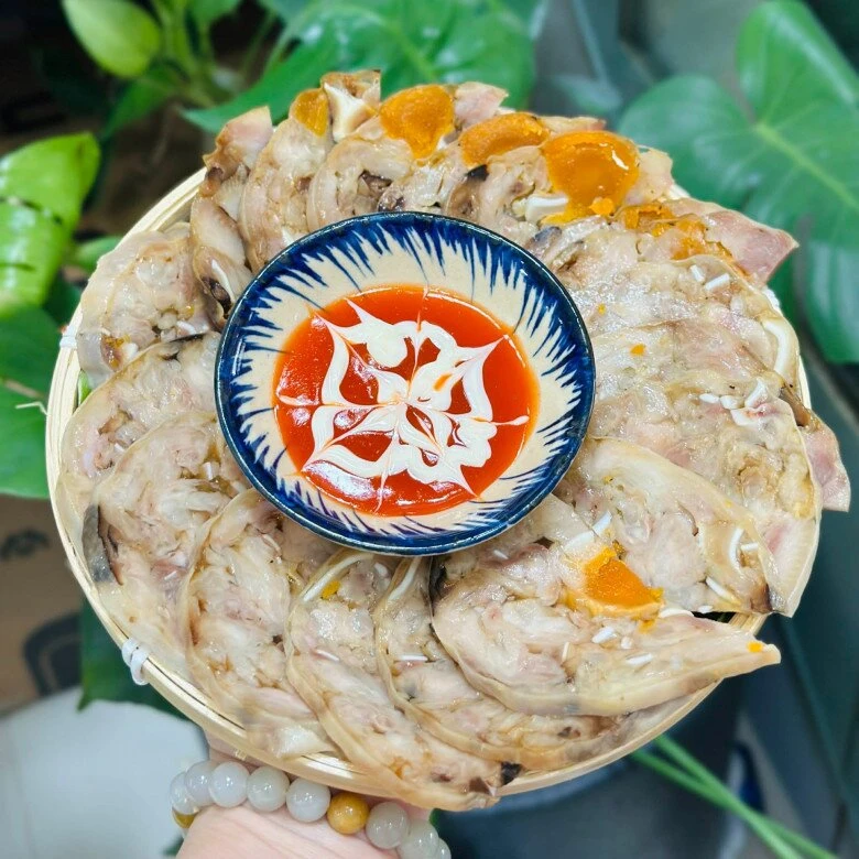 Thái lát vừa ăn. Khi ăn cảm nhận rõ độ giòn sật sật của chân gà - tai heo, béo bùi trứng muối.