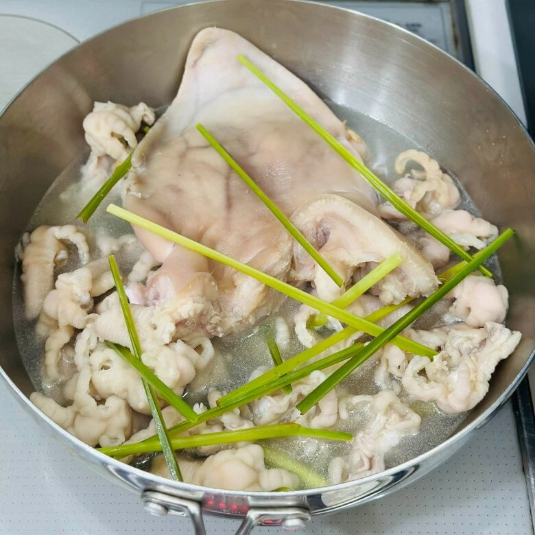 Chân gà và tai heo luộc trần sơ với gừng cho sạch, vớt ra để ráo.