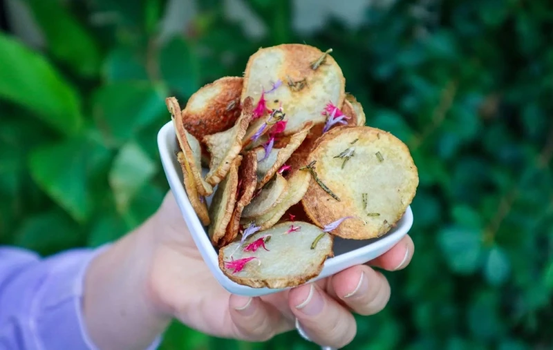Sau khi rửa sạch và gọt vỏ, bạn hãy đập dập củ dong riềng, ướp gia vị trong khoảng 1 tiếng rồi chiên vàng giòn. Món này có hương vị độc đáo, giòn rụm bên ngoài và mềm bùi bên trong. Vì vậy, củ dong riềng chiên giòn sẽ rất thích hợp làm món ăn vặt hoặc ăn kèm trong bữa cơm.