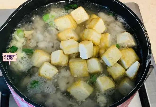 Thêm đậu phụ đã chiên vào, nêm muối, tiêu vừa ăn. Đun lửa vừa.