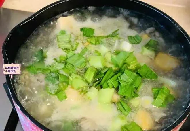 Khi canh sôi lại, thả tỏi tây và rau mùi cắt nhỏ vào rồi tắt bếp ngay.