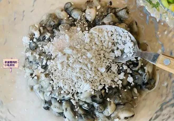 Pha bột: Cho hàu vào bát lớn, thêm bột khoai lang trộn đều thành hỗn hợp sệt.